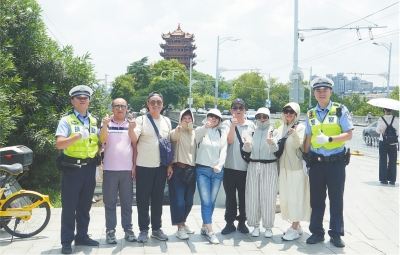 外地来汉游客邀请武昌交警在武汉长江大桥旁合影留念。 |