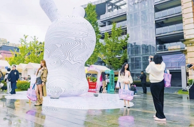 平和坊广场,市民在武汉艺术生活季的户外艺术装置前拍照留影。 |