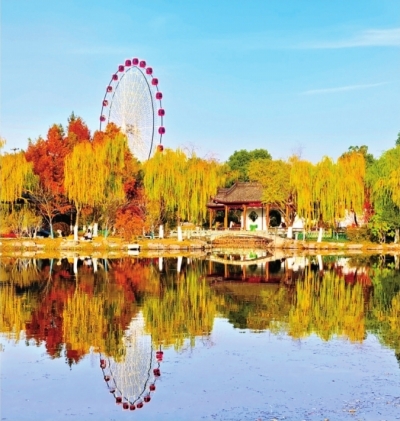 日染湖园柳色黄,古亭桥影入晨光。摩天轮下悬空镜,一镜揉碎半城阳。