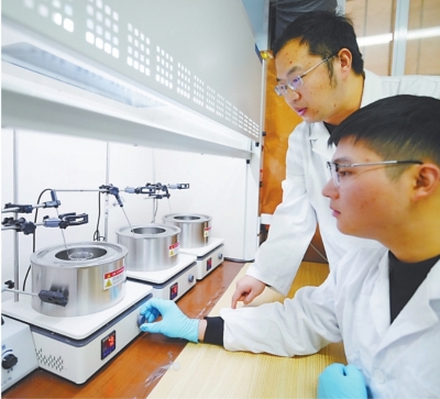 武汉理工大学船海与能源动力工程学院教师吕松(后)和参与研发出新型水凝胶的学生杨博文一起做实验。 长江日报记者何晓刚 摄 |