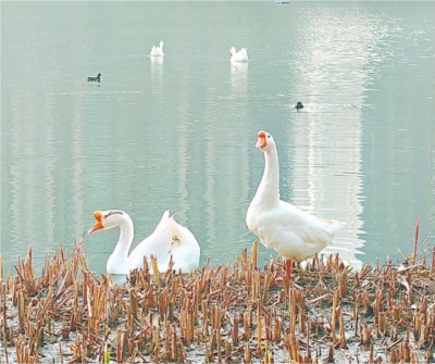 北湖中的白鹅。 长江日报记者许魏巍 摄 |