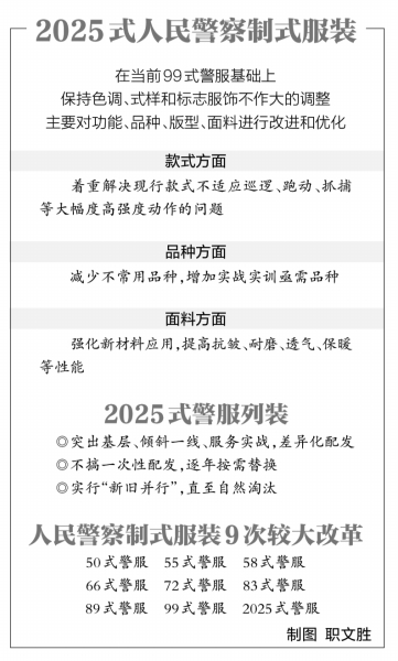 2025式人民警察制式服装由公安部组织设计,按照1个警服品种对应多个款式、多种面料的“1+N+N”的体系化创新思路,在当前99式警服基础上继承和发展,保持色调、式样和标志服饰不作大的调整,主要对功能、品种、版型、面料进行改进和优化。