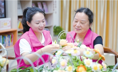 刘玺(左)和“粉色玫瑰”志愿队成员陈华一起编织手工艺品。 |