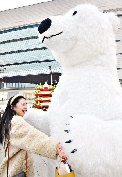 游客和巨大的“北极熊”亲密拥抱。 长江日报记者詹松 摄 |