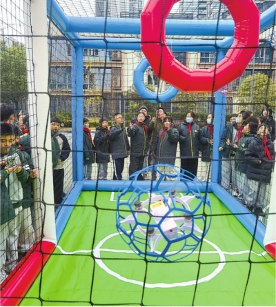 “左手控制高度,右手掌握方向,避开‘球门’防守!”操场俨然成为“空中竞技场”。六(3)班学生陈斯婉指尖在遥感控制器上灵活滑动,无人机如银燕般穿梭,精准将足球撞入对方“球门”。“原来以为很难,试了几次才找到感觉!”刚完成体验赛的她脸颊通红,兴奋地跟小伙伴分享“战果”。