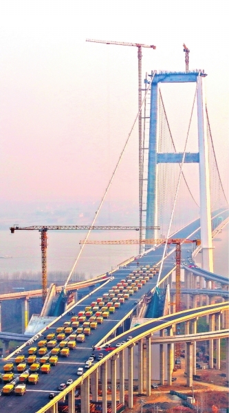 12月18日,128辆满载重卡列队从50.5米宽、双向8车道的桥面驶过,长江上最宽钢箱梁悬索桥——武汉双柳长江大桥进行荷载试验,历时3年建设的武汉市第12座长江大桥距离通车又近了一步。