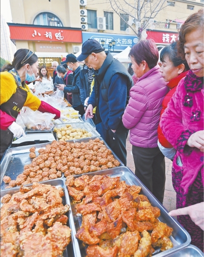 现场炸制的肉圆子、鱼块和卤菜等食品受到居民热捧。 长江日报记者喻志勇 摄 |
