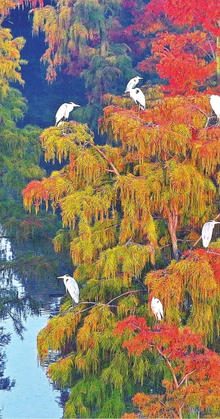 冬日的武汉新洲涨渡湖公园,万余株池杉披上了红装,远远望去,仿佛一片火红的云霞。慕名而来的游客无不陶醉于这片美景。12月18日,市民王慧兰与两位好友首次自驾来到这里,她感叹道:“环境整洁,停车便利,印象非常好。”