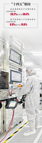 依托“五谷”,“十四五”期间,武汉高新技术产业增加值占GDP的比重从26.2%提升到30.4%,数字经济核心产业增加值占GDP的比重从8.9%提升到14.6%。全市高新技术企业数量从8000多家增长到16000多家,每万家企业中高新技术企业数量达171家。