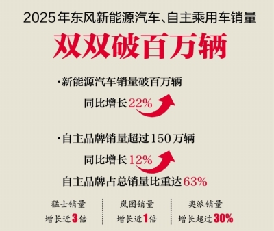 2025年,东风汽车新能源汽车销量高质量跨越100万辆,自主品牌销量突破150万辆,占总销量比重达63%,企业发展结构完成了由“合资主导”向“自主挑大梁”的实质性转变。