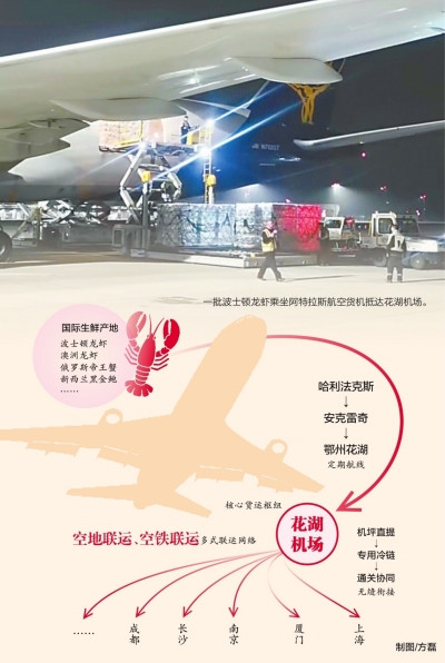“打通空中通道只是第一步,让优质生鲜快速到‘餐桌’才是关键。”宫海旺说,目前,公司引进的波士顿龙虾、澳洲龙虾、俄罗斯帝王蟹、新西兰黑金鲍高品质海产,已通过空地联运、空铁联运等多式联运网络,迅速分拨至上海、南京、厦门、成都、长沙等国内主要消费城市,并已成功进入“盒马鲜生”等新零售渠道,“价格更实惠了,老百姓‘菜篮子’也更丰富了”。