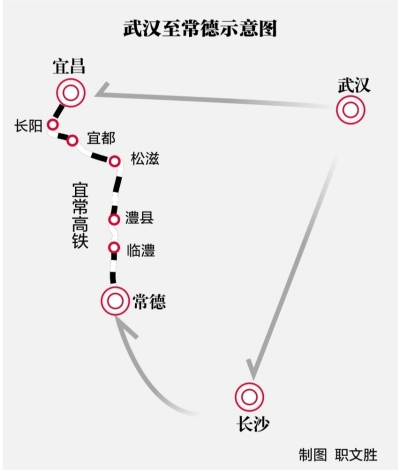 宜常高铁建成通车后,武汉至常德可直达,车程为两个半小时。