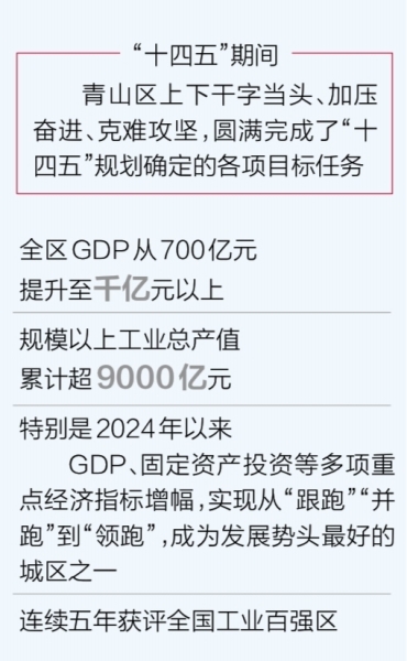 “青山是全国闻名的工业基地,在全市‘车钢油烟’四大板块中,青山独占两席,我们的最大特色、最大底气就是‘实体经济’。因此,‘十五五’时期,我们将聚焦全市‘五个中心’建设,加快构建以先进制造业为骨干的现代化产业体系,推动产、城、人相得益彰,到2030年,GDP突破1500亿元,基本建成新型工业化强区。”余志成说。