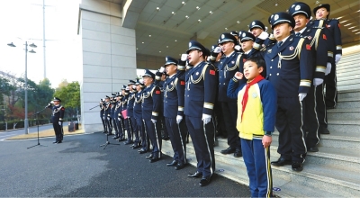 1月9日上午,光谷二小学生姜安迪受邀参加武汉东湖高新公安分局的升旗仪式。 |