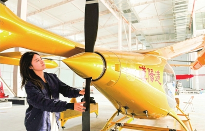 罗雅芳在吨级电动垂直起降飞行器旁进行起飞前的校验检测工作。 长江日报记者刘晨玮 摄 |