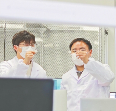 联华智造(武汉)生物科技有限公司联合创始人刘智勇(右)与同事正在观察客户生物样本。 |