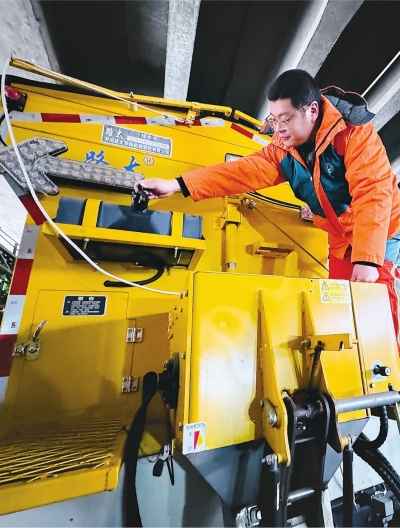 环卫人员检查撒布机,一次可装载8立方米融雪剂。 长江日报记者陶常宁 摄 |