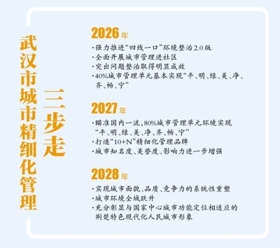 《方案》分为“三步走”:2026年,强力推进“四线一口”环境整治2.0版,全面开展城市管理进社区,突出问题整治取得明显成效,40%城市管理单元基本实现“平、明、绿、美、净、齐、畅、宁”。2027年,瞄准国内一流,80%城市管理单元环境实现“平、明、绿、美、净、齐、畅、宁”,打造“10+N”精细化管理品牌,城市知名度、美誉度、影响力进一步增强。2028年,实现城市面貌、品质、竞争力的系统性重塑,城市环境全域跃升,充分彰显与国家中心城市功能定位相适应的荆楚特色现代化人民城市形象。