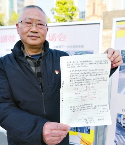 胡江顺带着自己手写的交通建议稿参会,上面还有他绘制的路口设计图。他建议3个点位改造:北城路由单行道改为双向通行,锦绣二路往拦江路方向打开左转车道,拦江路进入南城巷的左转掉头车道在修改停车线位置后改到最左侧。