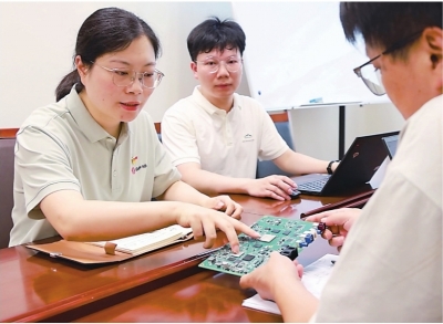 裴双红(左)和同事探讨智能驾驶芯片技术问题。 |