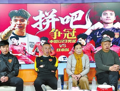 1月24日晚,U23国足队长刘浩帆的父母(右一刘绪全、右二胡冬珍)及启蒙教练杨涛(左二)受邀到长江日报直播间一起观赛。 长江日报记者高文举 摄 |