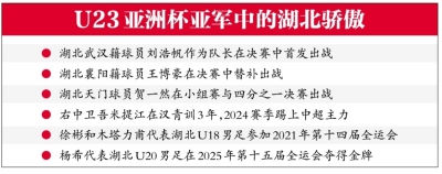 这支U23国足中的徐彬和木塔力甫曾代表湖北U18男足参加2021年的第十四届全运会,杨希代表湖北U20男足在2025年第十五届全运会上夺得金牌,这三名球员也都在与日本队的决赛中以首发身份登场。