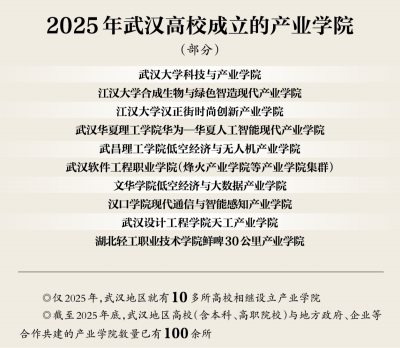 长江日报记者统计,截至2025年底,武汉地区高校(含本科、高职院校)与地方政府、企业等合作共建的产业学院数量已有100余所,且数量仍在持续增长。