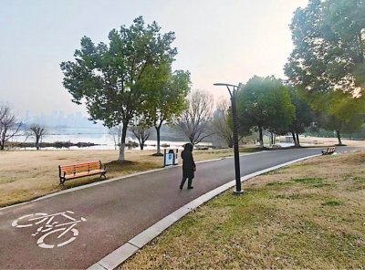 1月22日下午,长江日报记者实地探访墨水湖公园北岸。记者从西门停车场往东北方向骑行,可见绿道两侧长椅确有不同朝向,有的面湖,有的背湖,还设有临湖观赏椅。往西南方向,靠近水墨清华小区二期的绿道旁,座椅则大多背对着湖面。