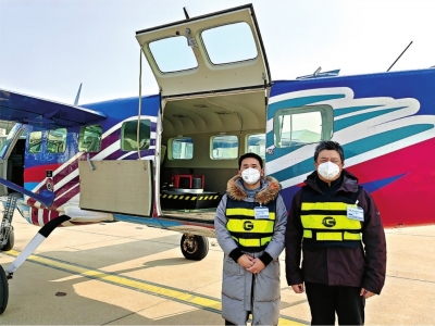 傅晓俊(右)和同事准备进行航摄,身后是已安装好航摄仪器的专用飞机。 |