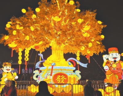1月28日下午5时40分,武汉园博园所有花灯齐点亮,市民在高达12米的“发财树”前打卡留影。