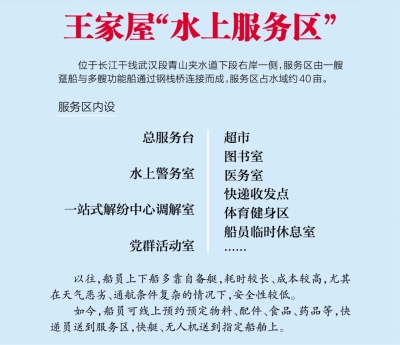 近日,由湖北港口集团旗下的武汉港务集团等投资建设的王家屋水上绿色综合服务区(下称服务区)投入使用,长江武汉段江畔有了一处服务长江航运船员的“温馨之家”。