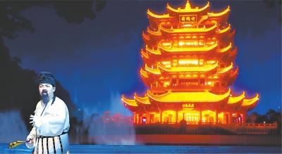 ■ 黄鹤楼 《AI在黄鹤楼》演出现场,“李白”在黄鹤楼前吟诗。 长江日报记者樊友寒 摄 |