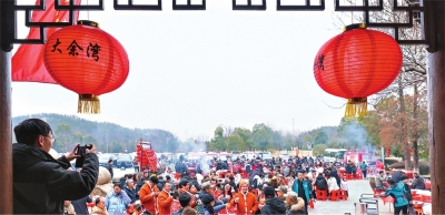 ■ 黄陂大余湾 2026年大余湾第三届新春庙会在阵阵锣鼓与欢笑声中温暖启幕。图为市民游客在大余湾吃家宴。 李霖 摄 |