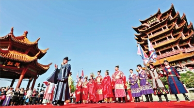 姜华(前)在黄鹤楼主持中式婚礼秀。 |