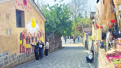 司莫拉佤族村里的游客模仿彩绘动作。 |