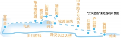从户部巷步行5分钟,中华路2号码头上,“江汉揽胜”轮渡专线正等待启航。家住汉阳的林女士带着8岁的儿子夏小龙登上甲板,“我们刚在长江大桥、斗级营拍照,现在坐轮渡回去,这条线将蛇山、龟山串联起来,游玩非常方便。”