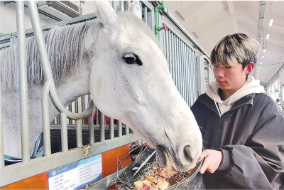 “这是第一次留在学校和马过年。”李京鸿说,每天早上6时起床,先到马房为马儿铲垫料、清理卫生,然后为马儿添水、喂饲料。8时多,自己才能闲下来吃早饭,晚上检查完马房已过22时。“陪马儿过年,能保持每天两个小时训练,还能多了解马儿习性,配合起来也会更默契。”