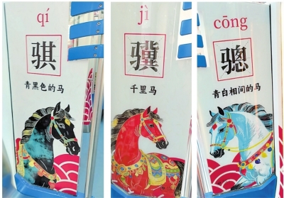 最让我惊奇的是几幅色彩鲜艳的马匹图案:骐、骥、骢……每匹马都配着拼音和解释,画风充满了传统年画的韵味。马儿身披华丽的装饰,鬃毛飘逸,在红色的祥云纹样衬托下,显得格外精神。