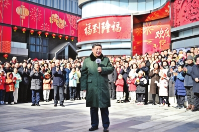 正值农历小年,隆福大厦前,新春市集吸引了大量市民和游客。习近平饶有兴致察看各式年货摊位,同现场群众亲切交流。他愉快地向大家讲起年少时多次到隆福寺的情景,还购买了几份特色食品和文创产品。