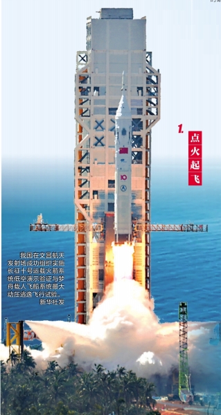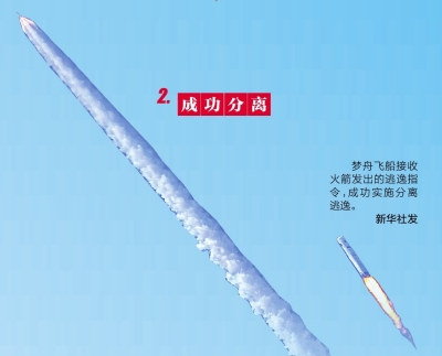 11时00分,地面试验指挥中心下达点火指令,火箭点火升空,到达飞船最大动压逃逸条件,飞船接收火箭发出的逃逸指令,成功实施分离逃逸。火箭一级箭体和飞船返回舱分别按程序受控安全溅落于预定海域。