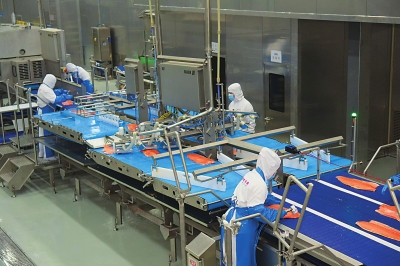 亚洲最大的三文鱼智能生产线上,工人在加工作业。 |