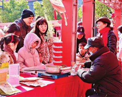 临近新春的江岸处处张灯结彩、年味浓郁。11日,在咸安坊举办的一场非遗文化大集上,吹糖人、画脸谱、剪窗花的互动体验区前围满了人,大人、小孩都跃跃欲试,希望亲手体验非遗乐趣。专程从孝感赶来的陈先生逛得不亦乐乎:“在这里不仅能一次逛遍、买齐各地的非遗年货,还能让孩子亲身体验,既长见识又玩得开心,这趟来得值!”