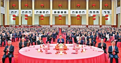 人民大会堂宴会厅灯光璀璨、喜气洋洋,各界人士2000多人欢聚一堂、共迎佳节,现场洋溢着欢乐祥和的节日气氛。