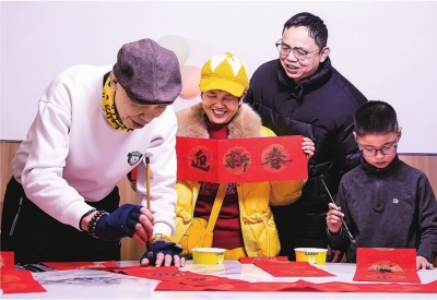 长江日报讯(记者史强)2月15日,农历腊月二十八,在这一天贴春联已是汉阳区建桥街道琴台社区居民胡金荣一家的习惯。一大早,她就将老伴胡家元在家族团年饭上现场书写的春联张贴起来。