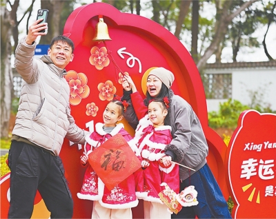 紧随其后的是别开生面的“梅间快闪”活动。在“雪海寻香”与“梅台映雪”等景点,身着传统服饰的舞者们以灵动舞姿传递祝福,并向前来围观的游客赠送精心包装的甜蜜糖果。在春节氛围“幸运铃”处,不少家庭在这里打卡拍照,“拍下一张年味全家福,新的一年一定会幸运满满。”重庆游客胡欣笑着说。