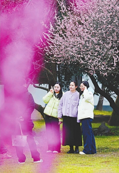 同期,东湖梅园多处景点均开展起丰富多彩的新春特色活动,影壁前舞狮铿锵腾跃,冷艳亭内琵琶婉转,“梅妻鹤子”景点长嘴壶茶艺尽显非遗魅力。“来,看这里,一二三,梅花开!”摄影师话音刚落,刘先生一家五口在盛放的梅树下绽开笑容,这张全家福将成为他们家庭相册中又一页珍贵的记忆。