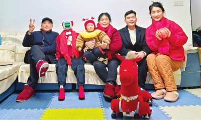 2月16日,除夕,陈警一家人与身穿红卫衣的机器人一起拍摄全家福。 |
