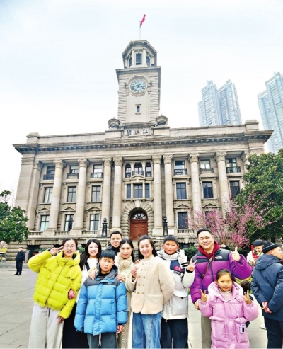 江汉关 来自江苏南京的孙先生(左四)一家人和同事自驾来汉游玩,他们在江汉关大楼前合影留念。 长江日报记者詹松 摄 |