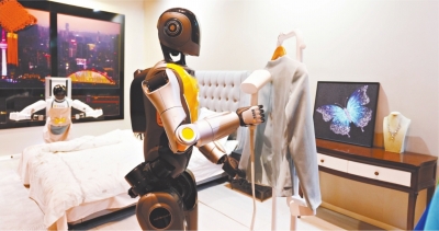 2月24日,汉产机器人亮相全市科技创新大会。图为光子机器人自主熨烫衣物,扫床机器人清洁床铺。 长江日报记者何晓刚 摄 |