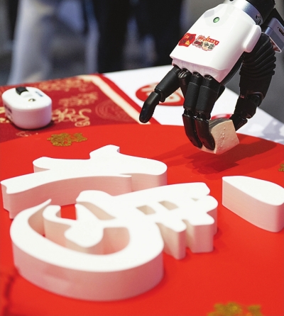 “天问”“远游”“荆楚”写春联,“光子”握着毛笔写“福”字。
